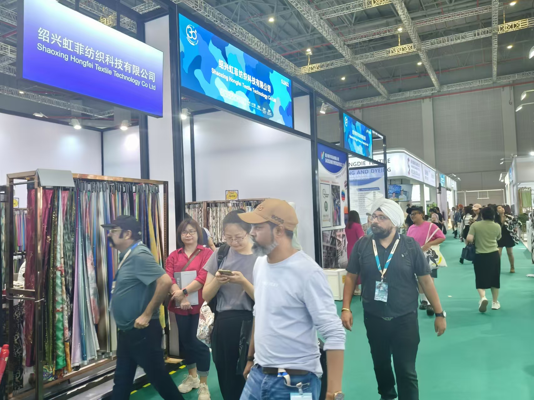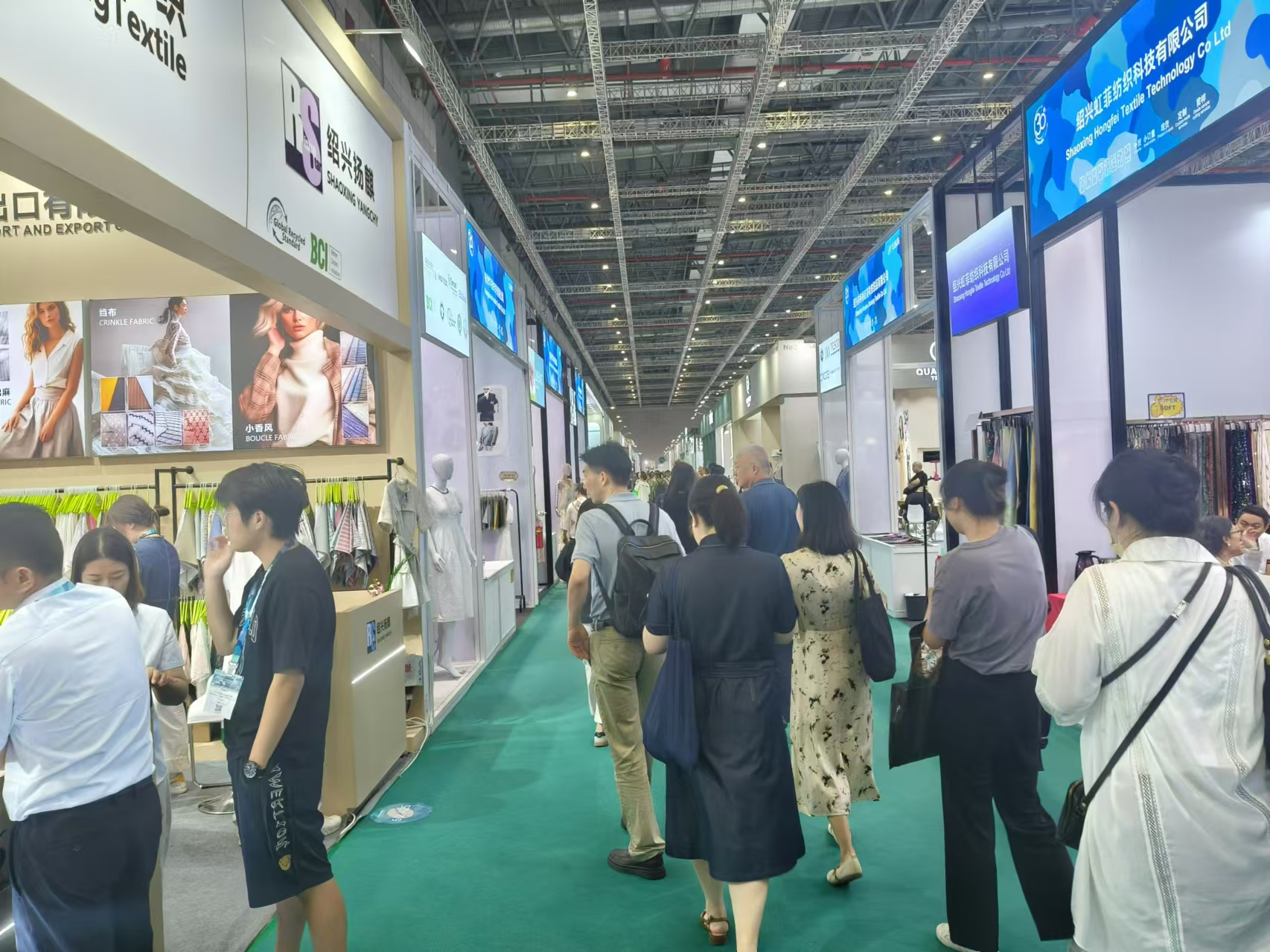 在展会上,我公司展出了最新研发的环保面料和创新纺织技术,受到了广泛关注。我们的展位吸引了大量客户前来参观洽谈,特别是在可持续发展和智能制造方面的产品.